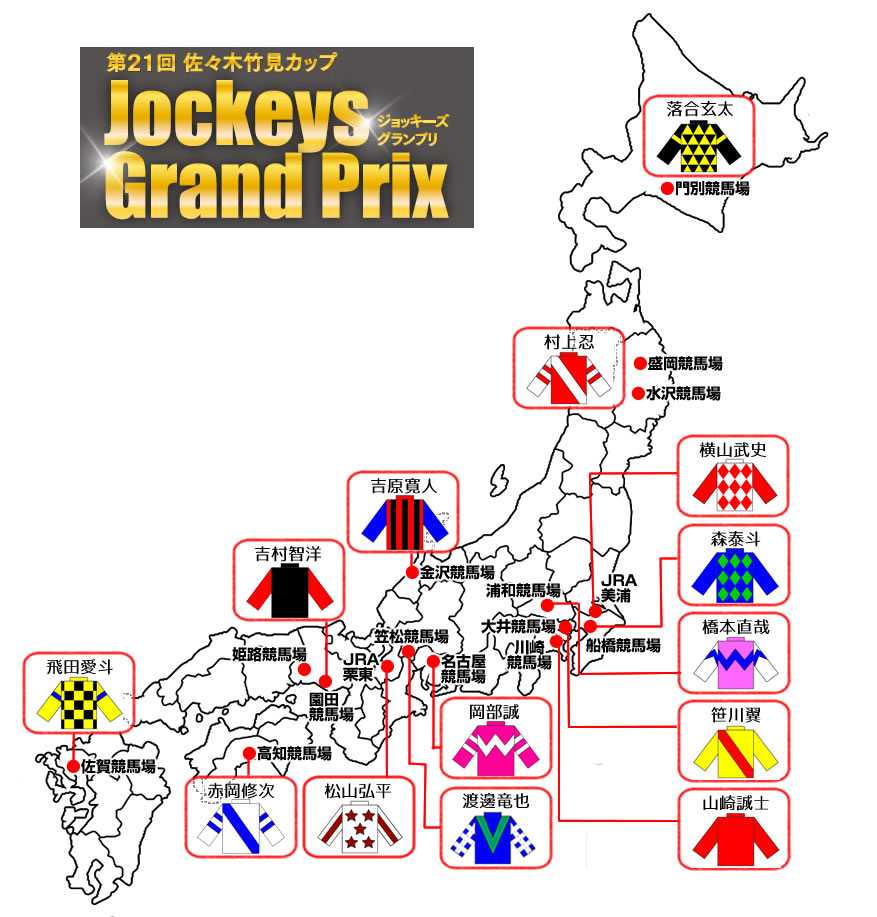 1960年(昭和35年)のデビューから2001年(平成13年)に現役を引退するまでに 通算7153勝を挙げ、“鉄人”と呼ばれた川崎競馬の至宝・佐々木竹見騎手。同騎手 が築き上げた数々の記録やファンの記憶に残る名騎乗を讃え、引退の翌年度 (2003年1月)に創設されたのが「佐々木竹見カップジョッキーズグランプリ」です。 JRAを含めた各競馬場のトップジョッキーが川崎競馬場に集結。2レースが 行われ、その総合成績を競う“騎手の祭典”は今年で21回目を迎えます。