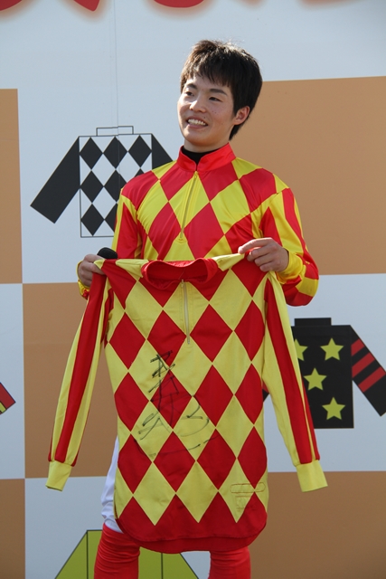 ![]() 町田直希騎手サイン入り騎手服 お手伝いに杉村一樹騎手(中)、と増田充宏騎手(左)もやって来ました。 | ||||