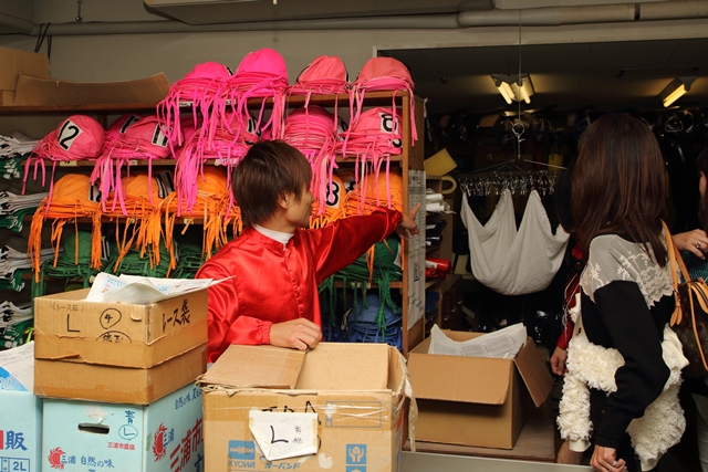 検量の様子を再現する拜原靖之騎手と増田充宏騎手(奥:瀧川寿希也騎手)