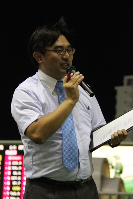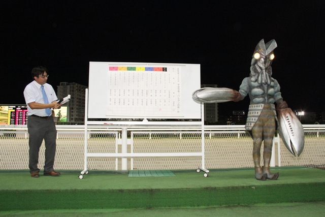 8R終了後 ウィナーズサークルにて 当日のメインレース 「怪獣酒場コラボ記念 宇宙忍者「バルタン店長」杯 の場立予想が行われました。 颯爽とウィナーズサークルに向かうバルタン店長