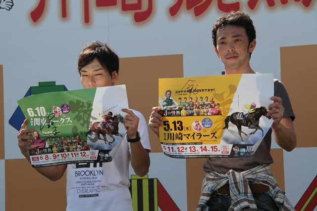 ![]() 騎手のサイン入り中吊りポスター お手伝いは 藤江渉騎手(右)と郷間勇太騎手(左) | ||||