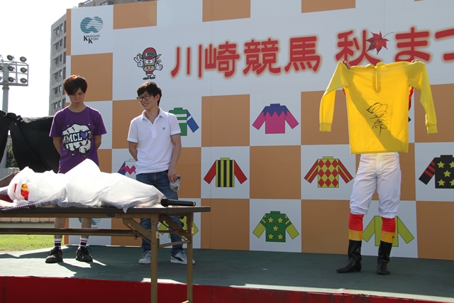 ![]() 町田直希騎手サイン入り騎手服 お手伝いに杉村一樹騎手(中)、と増田充宏騎手(左)もやって来ました。 | ||||