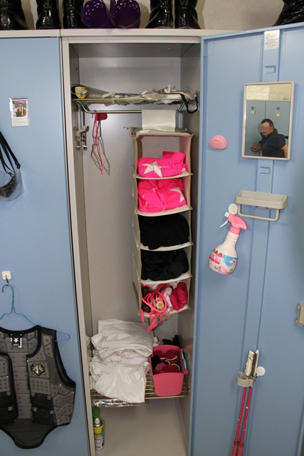 ![]() 内田利雄騎手のロッカー 整頓されています。 当然ながらピンク一色 ハンガー、クリップ、ファブリーズまでピンクです。 | ||||