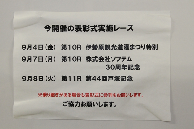 ![]() パドックへ出ていく騎手が分かる場所にある貼り紙 | ||||