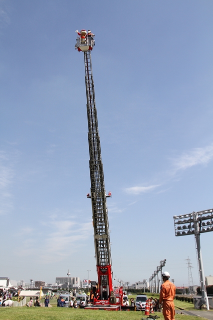 ![]() メタボ検診で腹回りを計っている…じゃなくて はしご車から落ちないように安全帯をつけてもらってます。 | ||||