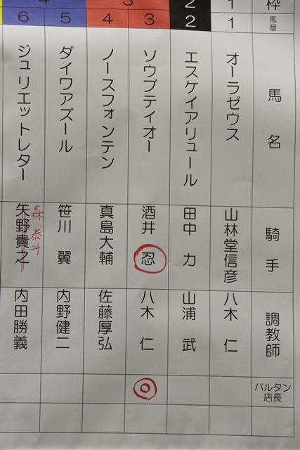 その忍者とは 酒井「忍」騎手(ソウブテイオー号に騎乗) であると… 今日は彼に勝つように使命してある。万全の体制のはずだ。 |