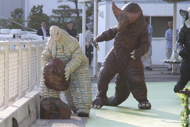 ジャミラがゴールしたのを見て、慌ててゴールに向かうゴモラとレッドキング。